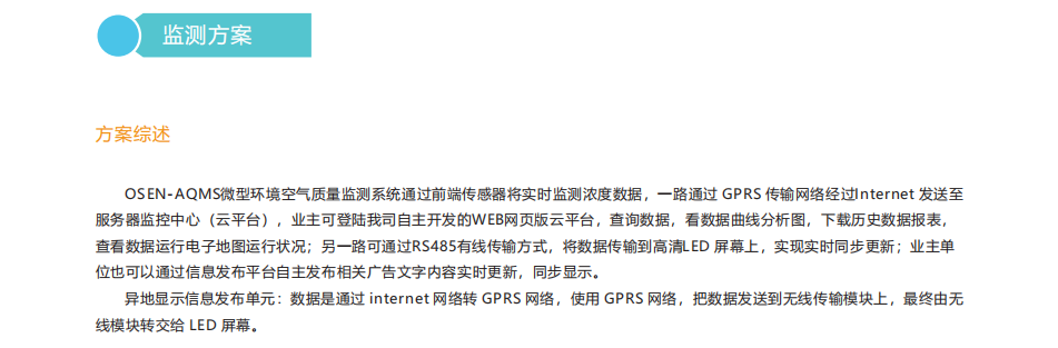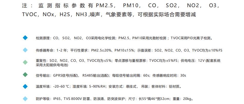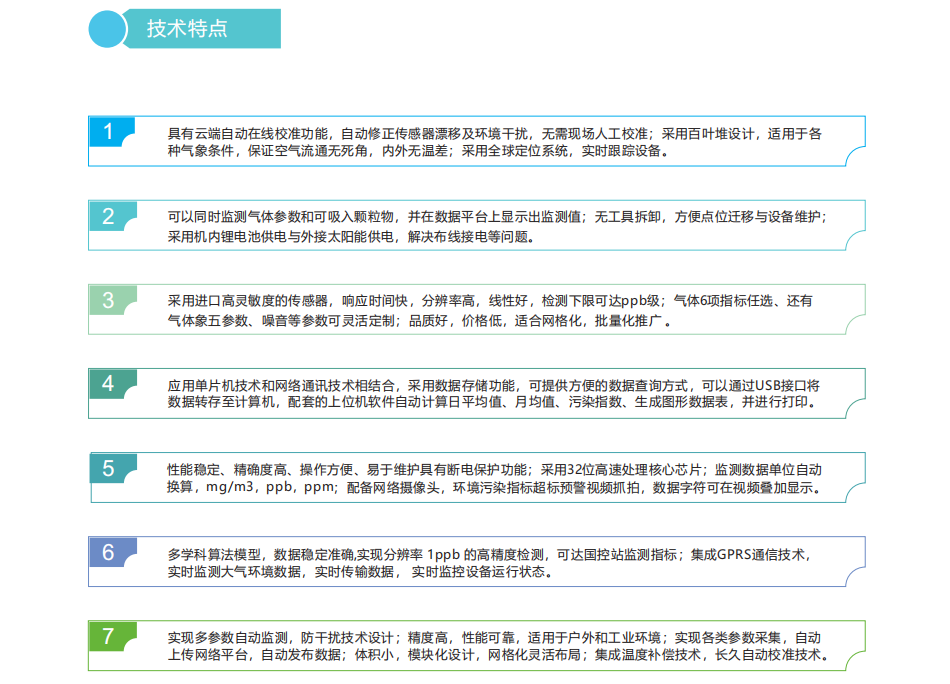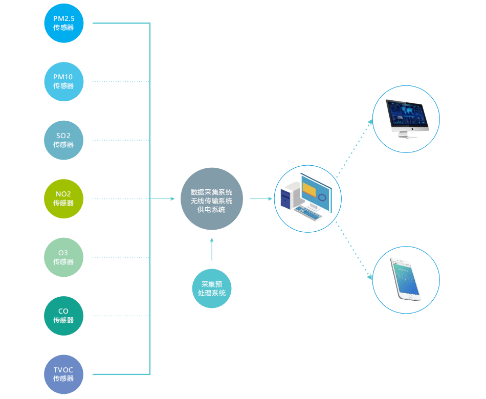 大气空气质量监测系统可实现区域空气质量的在线自动监测,能全天候、连续、自动地监测环境空气中的二氧化硫、二氧化氮、臭氧、一氧化碳、 PM2.5、PM10和有机挥发物的实时变化情况,迅速、准确的收集、处理监测数据,能及时、准确地反映区域环境空气质量状况及变化规律,为环保部门的环境决策、环境管理、污染防治提供详实的数据资料和科学依据。