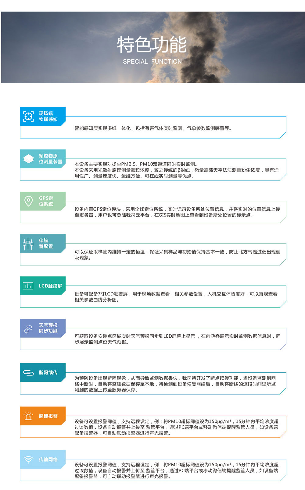 采用光散射、电化学、金属氧化物或光离子的传感器检测方法的,可以直接用于监测大气污染状况的监测设备,检测参数可以包含 TSP、PM10、PM2.5、SO2、NO2、CO、O3、TVOC 等其中的一种或几种。