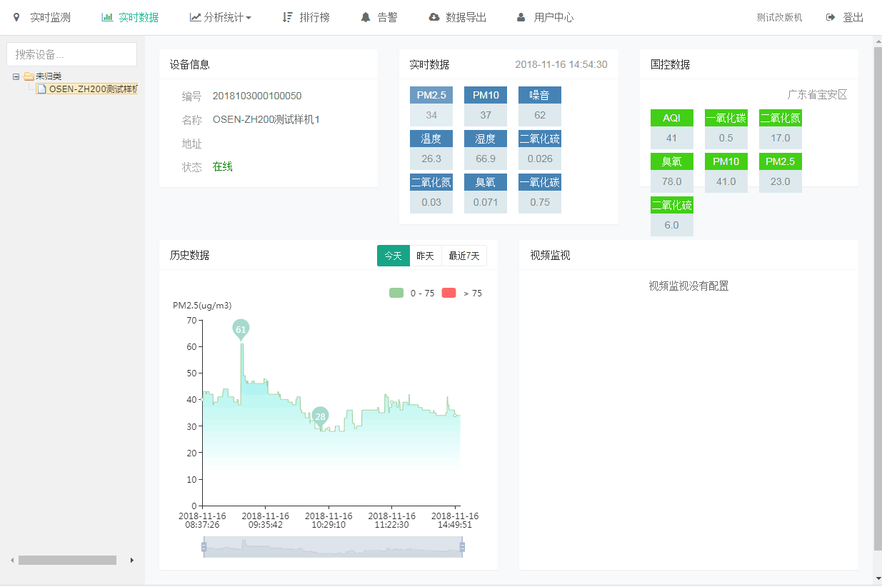 智能云实时展示设备当前的各项大气监测指标污染值及设备的在线状态,数据更新周期为3分钟;智能云是一款数据接收、保存、显示、分析、管理的专业数据分析软件。