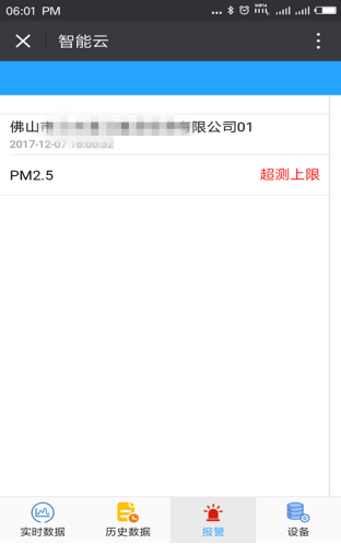 ●人性化:代替了短信报警提醒功能;设备报警时能及时地像短信一样通知手机用户,及时预警,避免罚单。甚至当环境比较污染,持续报警情况下,默认反复提醒,时间间隔为10分钟。不需要像短信报警,每次报警都会用户存入一条短信,然后每次都需要手动删除短信的繁琐操作,报警记录可查;